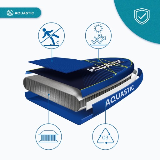 AQUASTIC Perth 10'8" została wykonana w technologii DROP STITCH LITE, dzięki której deska jest jednocześnie lekka i wyjątkowo wytrzymała. Jej struktura zapobiega odkształceniom, gwarantując odpowiednią sztywność i stabilność na wodzie. Górna warstwa deski została pokryta antypoślizgową pianką o grubości 3 mm, co poprawia przyczepność i zwiększa bezpieczeństwo użytkowania. Dodatkowy wzór w kształcie rombów nie tylko podnosi estetykę, ale także zapobiega ślizganiu się stóp na mokrej powierzchni.