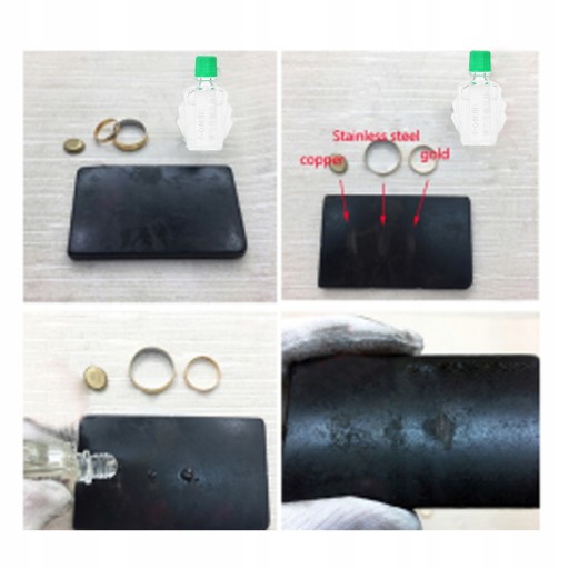 Bardzo łatwy w użyciu. Wystarczy nanieść kroplę tego roztworu na małą próbkę testowanego przedmiotu