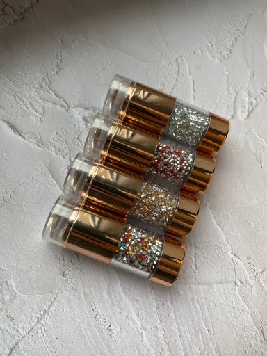 Wyjątkowy, dwuczęściowy stempel do zdobień wykonany z przezroczystego, miękkiego silikonu, ozdobiony kolorowymi kamyczkami wewnątrz. Funkcjonalna budowa pozwala na korzystanie z niego jako z jednego, dłuższego stempla lub rozdzielenie na dwie części — każda o innym przeznaczeniu: