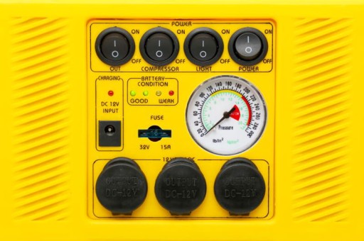 ✔️Prostownik został wyposażony w kompresor o ciśnieniu maksymalnym 300 PSI. Umożliwia on napompowanie awaryjne np. kół samochodowych.