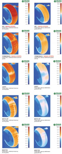 Zdjęcia wykonywane po 60 minutach grzania. Lewa kolumna ukazuje pomiar przy założonym kocu grzewczym, a prawa kolumna oponę po zdjęciu koca grzewczego.