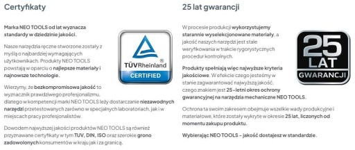 Wyposażenie warsztatu to przede wszystkim niezbędne narzędzia. Te oferowane przez markę NEO TOOLS spełniają wszystkie wymagania odnośnie wysokiej jakości i użyteczności. Mamy również uniwersalne oraz specjalistyczne sprzęty, które sprawią, że wyposażenie warsztatów stanie się pełne oraz kompletne. Razem z NEO TOOLS wyposażysz profesjonalny jak i hobbistyczny warsztat we wszystko, co w nim potrzebne!