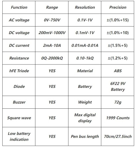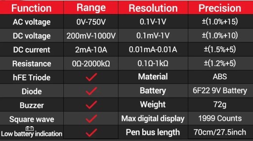 Rezystancja: 0Ω-2000kΩ, rozdzielczość: 0,1Ω-1kΩ, dokładność: ± (1,2% odczytu + 5 cyfr)