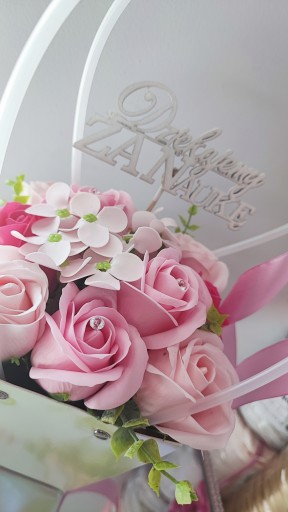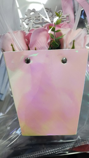 Torebka box z pachnącymi różami z mydła nadającymi się do kąpieli. Róże ładnie pachną i ślicznie wyglądają....Nie więdną jak prawdziwe kwiaty. Długo będą cieszyć oczy osoby obdarowanej...