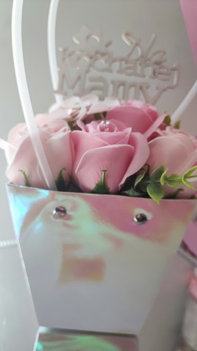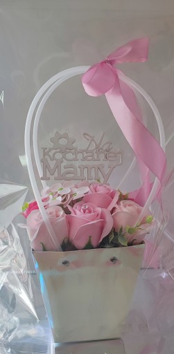 Torebka box z pachnącymi różami z mydła nadającymi się do kąpieli. Róże ładnie pachną i ślicznie wyglądają....Nie więdną jak prawdziwe kwiaty. Długo będą cieszyć oczy osoby obdarowanej...