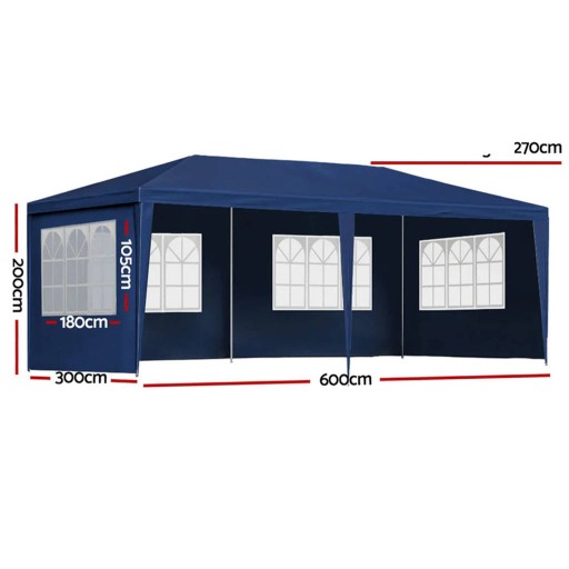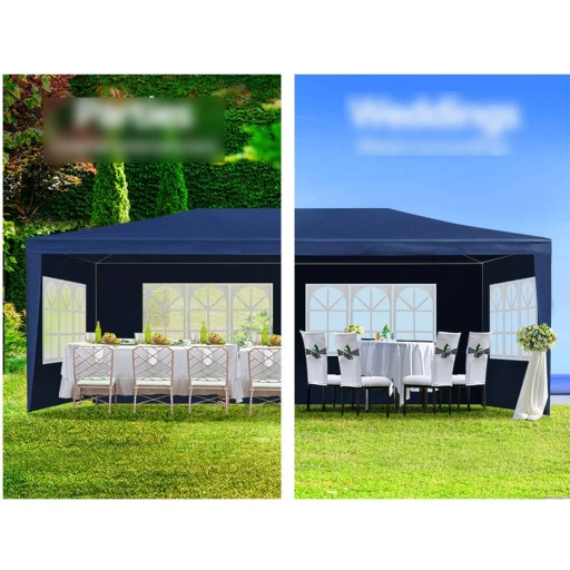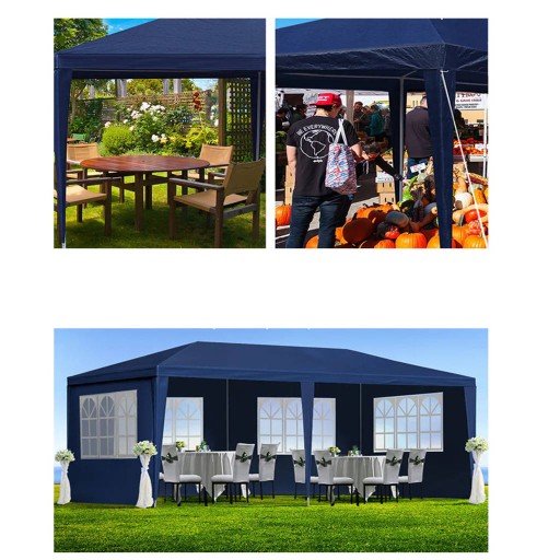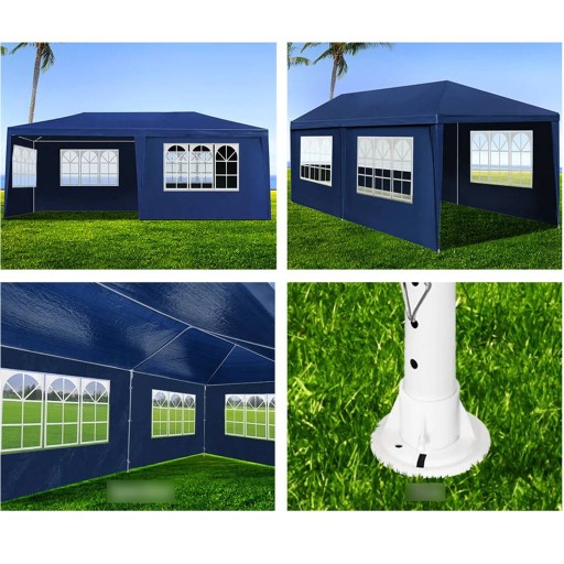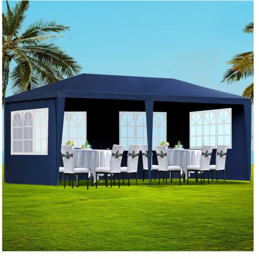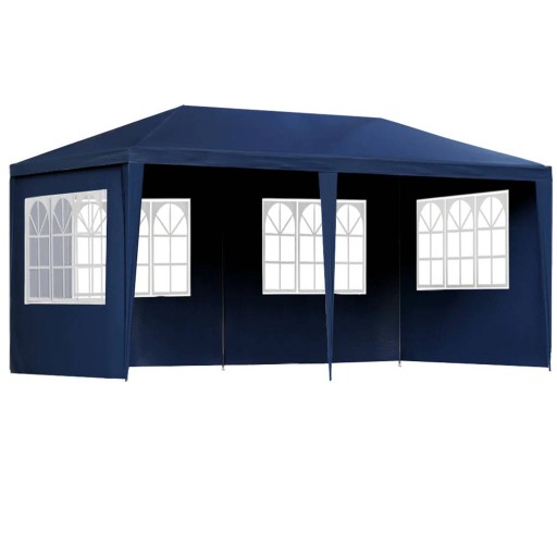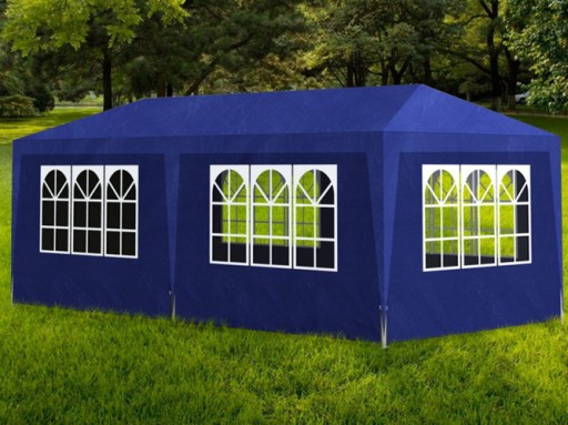 Pawilon ogrodowy - namiot handlowy 3x6 (niebieski) chroni przed nadmiernym słońcem i umiarkowanym deszczem. Wyjątkowo prosty i szybki w montażu. Wykonany z mocnego,odpornego na deszcz materiału. Pawilon idealny na imprezy w ogrodzie. Również świetny jako namiot handlowy. Złożony zajmuje niewiele miejsca. Bardzo krótki czas składania pomoże Ci szybko rozstawić lub złożyć pawilon.Nieprzemakalny materiał PE o gramaturze 110g/m2 (najgrubszy na rynku). Dodatkowym atutem naszego pawilonu jest od wielu lat sprawdzona konstrukcja. Rurki metalowe malowane proszkowo na kolor biały. Wszystkie potrzebne do złożenia elementy w komplecie (złączki, rurki, linki, śledzie, itd.).