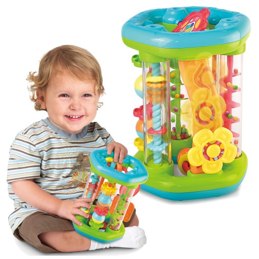 Zakręcony Roler z mnóstwem niespodzianek z każdej strony. Zabawka posiada kolorowe koraliki do przesuwania oraz zabawne klepsydry z przesypującymi się kuleczkami, które zapewnią najmłodszym wesołą rozrywkę. Roler tocząc się po podłodze zachęci dziecko także do nauki raczkowania.