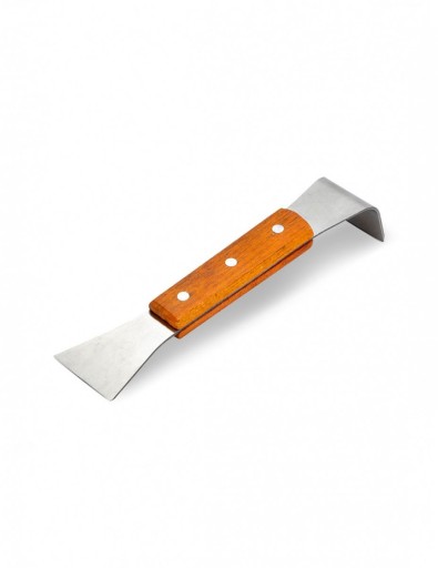 Dłuto pasieczne w oprawie drewnianej - jeden koniec dłuta zakrzywiony, drugi koniec dłuta ma kąt prosty.