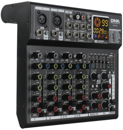 DNA QFX6 to profesjonalny analogowy mikser audio Bluetooth, wyposażony w sześć monofonicznych kanałów wejściowych, wyjście słuchawkowe (gniazdo 6,35 mm), dwa wyjścia AUX, dwa wyjścia REC OUT (cinch/RCA), kontrolę panoramy sygnału kanału, zasilanie Phantom +48V, złącze USB-B do podłączenia komputera, procesor DSP oraz intuicyjny odtwarzacz MP3. Sprzęt idealnie nadaje się jako mikser sceniczny do występów na małej scenie i koncertów, w salach prób, a także w domowym studiu nagraniowym.