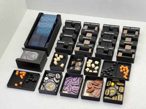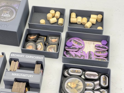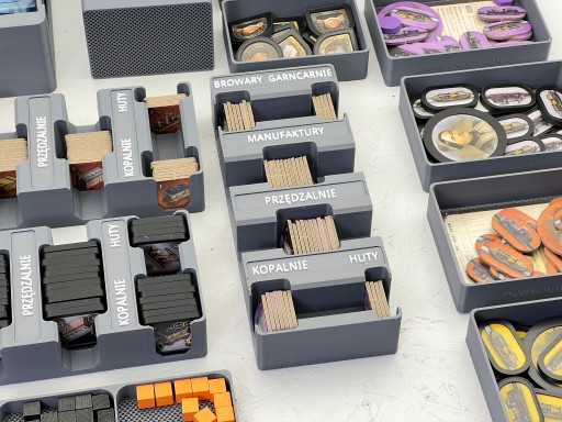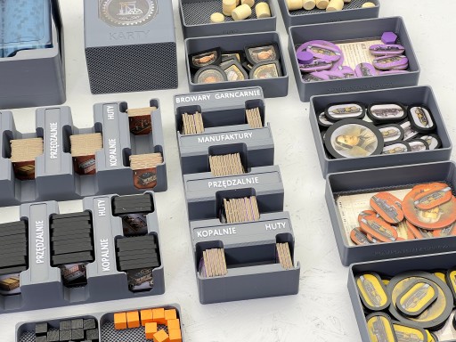 Insert dostępny w dwóch wersjach, różnią się pojemniki na budynki graczy. W jednej wersji przegródki są większe aby pomieścić żetony w naszych protektorach, w drugiej wersji przegródki są mniejsze (żetony bez protektorów nie będą się przewracać w przegrodach). Na zdjęciach widać oba te pojemniki (połowa żetonów jest w protektorach, połowa bez).
