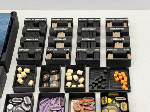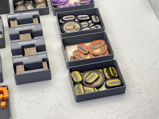 - pojemniki na budynki graczy są zaprojektowane tak, aby jak najbardziej ułatwić wyciąganie i wkładanie budynków. Wyraźne podpisy wskazują miejsca, w których trzeba umieścić odpowiednie budynki,