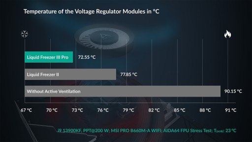 Zintegrowany wentylator VRM skutecznie chłodzi sekcję zasilania płyty głównej, co wpływa na stabilność pracy CPU. Arctic zastosował też przesuniętą płytkę kontaktową (offset mounting), by precyzyjnie trafić w najgorętszy punkt procesora, a specjalna ramka dla Intel zapewnia równomierny nacisk i optymalne przyleganie.