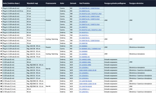 Niebieska tabela przedstawia dostępne systemy do montażu fotela (oparte na nogach)