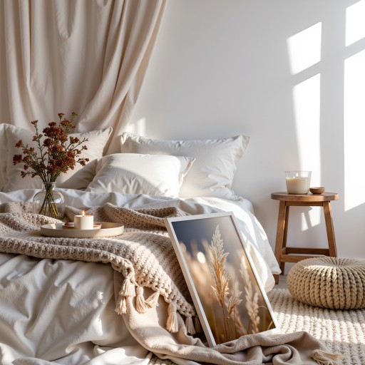 - Styl Boho – Kolekcja obrazów wpisuje się w naturalny i spokojny klimat boho, w którym dominują ziemiste barwy i przytulne akcenty, tworzące przestrzeń sprzyjającą wyciszeniu i kreatywności.