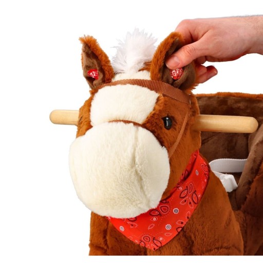 - interaktywny - po naciśnięciu ucha zabawka wydaje dźwięk galopującego konia; jedno ucho to krótki dźwięk rżenia, a drugie długi tętent końskich kopyt i rżenie