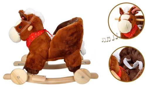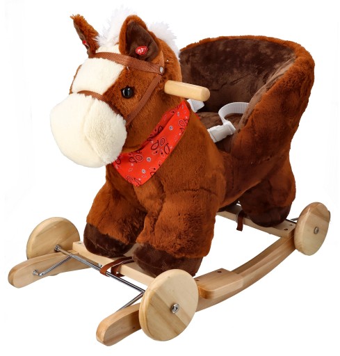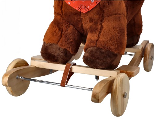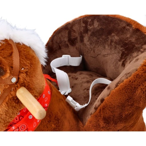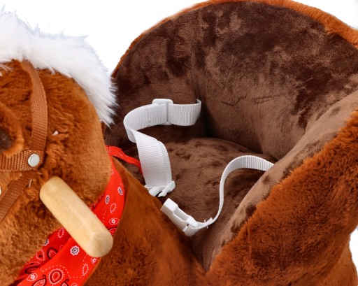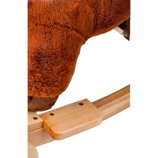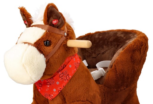 Śliczny tradycyjny konik do bujania z fotelikiem to świetny towarzysz zabaw i pierwszy przyjaciel dziecka. Zabawka będzie idealnym prezentem na roczek czy inną okazję. Konik wykonany jest z mięciutkiego i delikatnego w dotyku pluszowego materiału. Płozy i uchwyty na rączki wykonano z drewna. Całość utrzymana jest w brązowej kolorystyce z jaśniejszymi elementami, takimi jak pysk, grzywa i ogon. Konik wyposażony jest w fotelik z pasami bezpieczeństwa, dzięki czemu mogą się w nim bujać dzieci już od 10 miesiąca życia. Maluszek zapięty w pasy będzie mógł bezpiecznie korzystać z zabawki, bez ryzyka, że wypadnie z siedziska. Pas jest regulowany, dzięki czemu można go dostosować do aktualnych potrzeb.