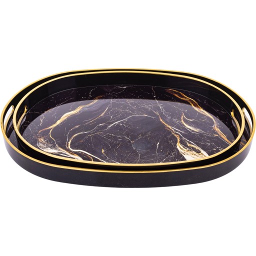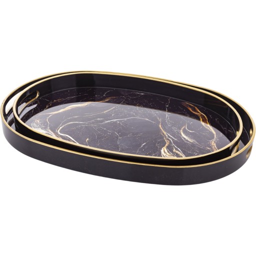 MARMUR Dekoracyjna owalna TACA z uchwytami KOMPLET 2 SZTUKI - CZARNA ZŁOTA