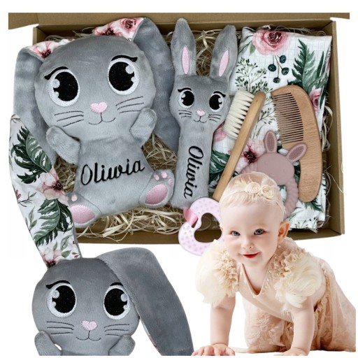 ➡️ Zestaw prezentowy szyty na zamówienie – z imieniem, metryczką i napisem