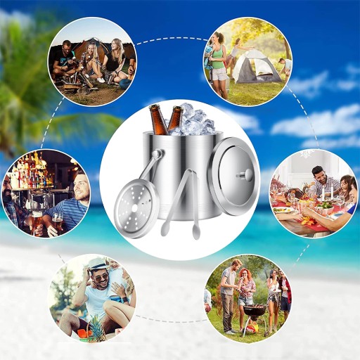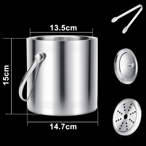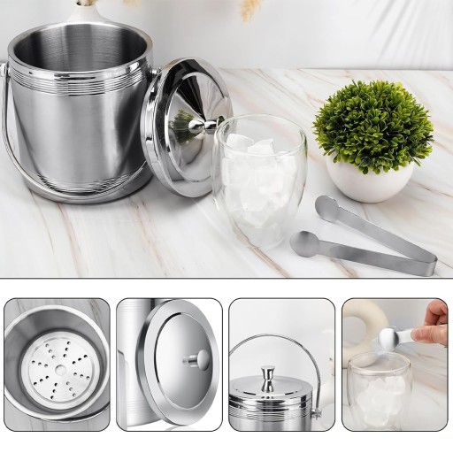 🧊Wiele akcesoriów: dwuwarstwowe wiaderko na lód wykonane ze stali nierdzewnej z pokrywką, szczypce do lodu. Szczypce do lodu umożliwiają precyzyjne chwytanie kostek, unikając bezpośredniego kontaktu dłoni z kostkami. Sitko umieszczone jest na dnie pojemnika na kostki lodu, aby zapewnić lepsze oddzielenie lodu od wody, co pozwala na dłuższe chłodzenie lodu