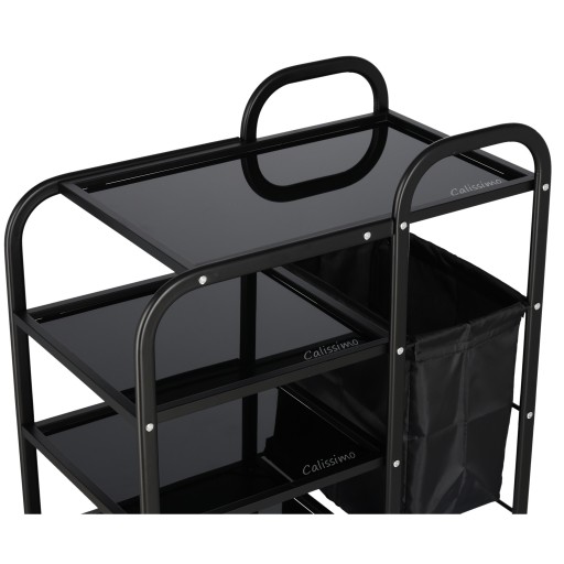 Funkcjonalny metalowo-szklany stolik na kółkach. Pomocnik posiada cztery szklane półki. Największa zaletą jest przymocowany do niego worek na brudne ręczniki i opaski kosmetyczne lub też inne rzeczy.