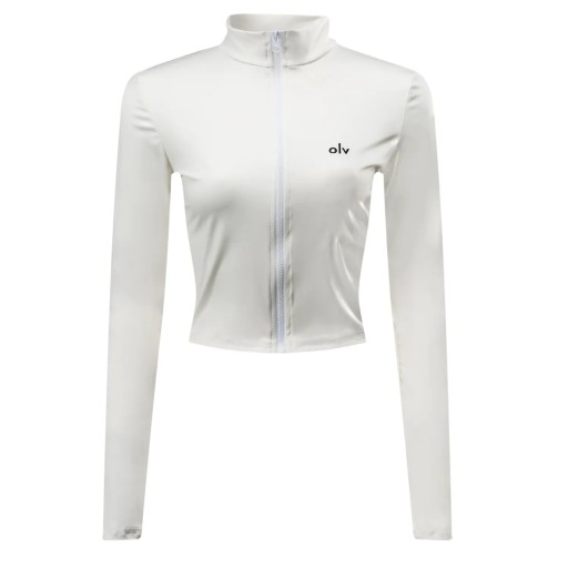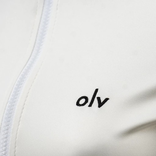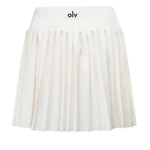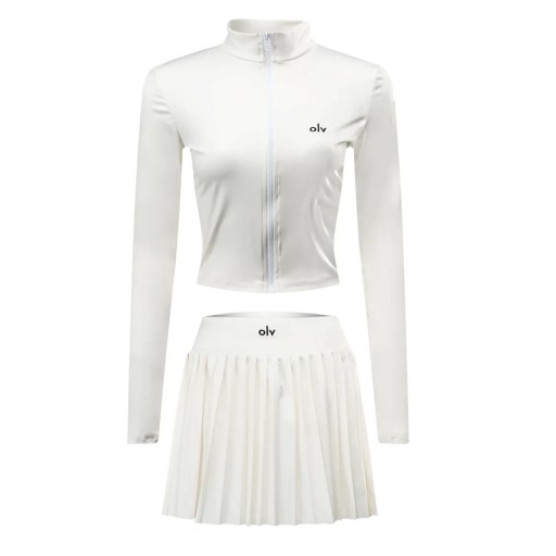 Sportowy komplet damski, wykonany z wysokiej jakości elastycznego oraz oddychającego materiału. Góra - rozpinana bluzka z długim rękawem. Rękawy posiada wycięcie na kciuk. Na przodzie minimalistyczny haft OLV. Dół - plisowane spódnico-spodenki. W pasie haft OLV.