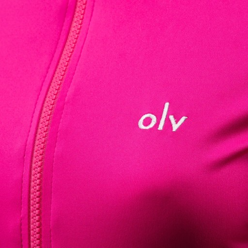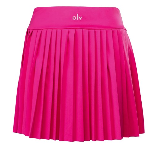 Sportowy komplet damski, wykonany z wysokiej jakości elastycznego oraz oddychającego materiału. Góra - rozpinana bluzka z długim rękawem. Rękawy posiada wycięcie na kciuk. Na przodzie minimalistyczny haft OLV. Dół - plisowane spódnico-spodenki. W pasie haft OLV.