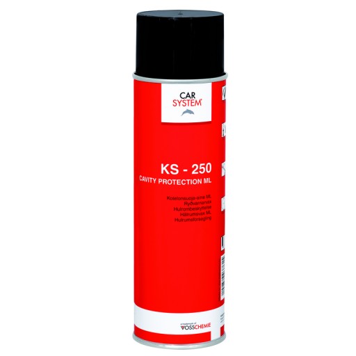 CARSYSTEM KS-250 Spray to środek ochronny przed korozją do przestrzeni zamkniętych. Ma konsystencję podobną do wosku, która po odparowaniu rozpuszczalnika tworzy elastyczną warstwę na podwoziu. Dzięki zdolności ochrony miejsc trudno dostępnych, odpierania wody oraz dobrej przyczepności do metali zapewnia niezawodną ochronę antykorozyjną przez kilka lat. Środek odporny na trudne warunki otoczenia, w tym długotrwałe narażenie na działanie słonej wody. Środek ma kolor brązowy.