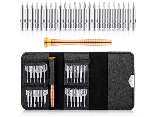Naprawa nowoczesnych urządzeń elektronicznych wymaga nie tylko umiejętności, ale również wykorzystania odpowiedniego, precyzyjnego sprzętu. Producenci stosują różnego rodzaju zabezpieczenia, co sprawia, że do ich otwarcia wymagane są dodatkowe końcówki, które trudno znaleźć w podstawowych zestawach wkrętaków. Zestaw specjalistycznych wkrętaków to 25 elementów znajdujących się w etui zamykanym na magnes. Każdy element posiada swoje własne miejsce, co pozwala na zachowanie porządku oraz sprawną organizację miejsca pracy, a tym samym jej szybkie i dokładne wykonanie. Komplet przeznaczony jest zarówno do napraw telefonów, smartfonów i tabletów jak również wszystkich innych urządzeń i sprzętów, które posiadają niestandardowe, drobne śruby.