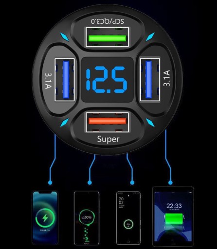 Ładowarka posiada cztery gniazda USB, w tym jedno do super szybkiego ładowania, co umożliwia jednoczesne ładowanie wielu urządzeń.