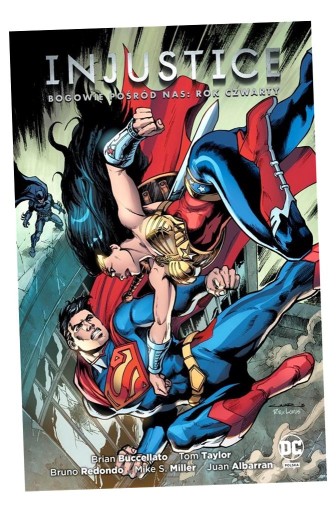 Od czterech lat Ziemia znajduje się pod rządami Supermana. Jego wrogowie zostali rozproszeni albo zabici, ale ruch oporu wciąż walczy! Po ostatniej porażce Batman w desperackim geście zwrócił się do Aresa, boga wojny, by zwerbować panteon greckich bogów do starcia z Supermanem. Człowiek ze Stali może i jest wystarczająco silny, aby zmierzyć się z bogiem... ale co się stanie, gdy jego najbliższa sojuszniczka i córka Zeusa, Wonder Woman, zwróci się przeciwko niemu? Tom "Injustice: Bogowie pośród nas: Rok czwarty", inspirowany fenomenalną grą wideo, opowiada o ludziach dysponujących niemal boskimi mocami, którzy starają się zaprowadzić ład w świecie ogarniętym chaosem. Scenariusz Briana Buccellato ("Flash") zilustrowany został przez Brunona Redondo ("Earth 2", "Suicide Squad: Zła Krew"), Mike'a S. Millera ("Batman: Arkham Unhinged") i wielu innych znakomitych rysowników. Dodatkowo zamieszczono historię pierwszego scenarzysty serii Toma Taylora ("DCeased"). Album zawiera materiały opublikowane pierwotnie w amerykańskich zeszytach "Injustice: Gods Among Us: Year Four" #1-12 oraz "Injustice: Gods Among Us: Year Four Annual" #1.