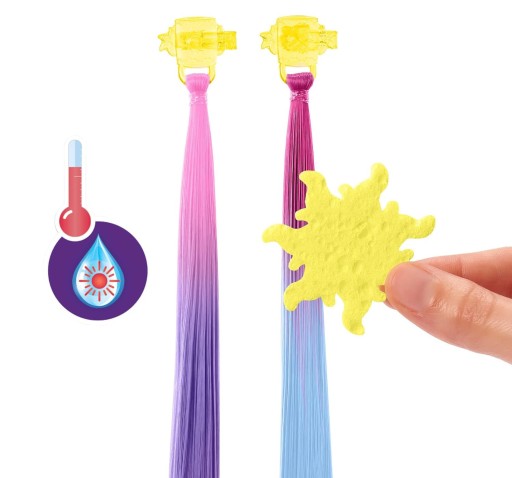 - Roszpunka posiada 2 przyczepiane pasemka włosów, które zmieniają kolor w cieplej wodzie: z fioletowego na różowe oraz z różowego na niebieskie,