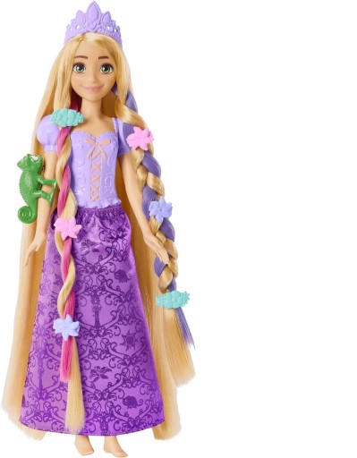 Urocza lalka Roszpunka, wygląda wprost jak z bajki. Lalka ma oczywiście długie piękne blond włosy. Włosy są tak długie, ze można by nimi opleść cała lalkę. Nadają się idealnie do czesania, w zestawie znajduje się szczotka do włosów, pasemka doczepiane, które można farbować za pomocą gąbki, 9 akcesoriów do stylizacji włosów. Dodatkowo w zestawie Lalka Flynn jest najbardziej poszukiwanym – i najbardziej czarującym – złodziejem w królestwie. Lalki nie stoją samodzielnie.