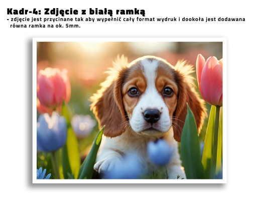 Zdjęcie jest docinane do proporcji wybranego formatu, następnie na około. 5mm dookoła jest dodawana biała ramka. Ta opcja sprawdza się najlepiej w anty ramach lub w zdjęciach naklejanych na większe projekty.