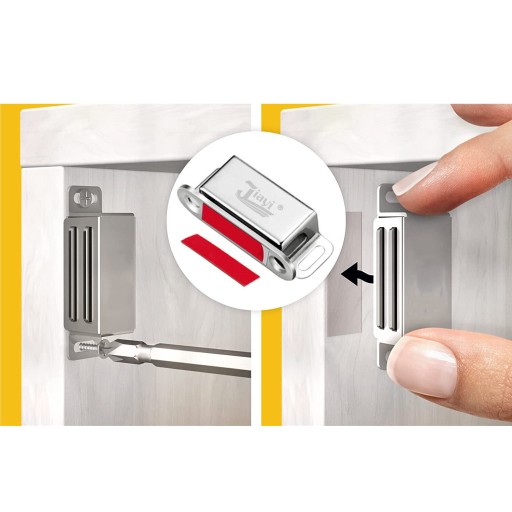 🚪🚪【Dobrze wykonane】Owalne otwory na śruby pomagają również w regulacji położenia, tak aby stalowa płytka była wyrównana z częściami magnetycznymi. Te magnetyczne zamki meblowe wyposażone są w śruby montażowe ze stali nierdzewnej. Nie musisz martwić się o śruby, które łatwo mogą się złamać podczas montażu.
