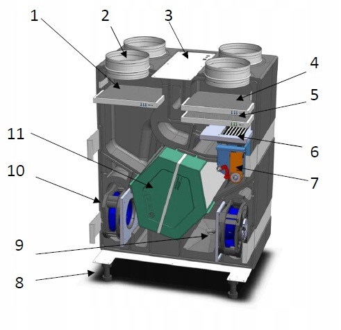 Korpus główny wykonany jest z materiału EPP. Jest doskonałym izolatorem dźwięku, zmniejsza drgania, chroni przed hałasem. Poprzez wykonanie specjalnych felców połączeniowych w poszczególnych elementach, obudowa zamknięta, jest w stu procentach szczelna, co przekłada się na bardzo dobre wyniki sprawności odzysku ciepła.