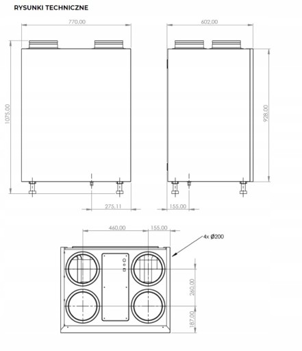 2. Przyłącza podłączenia do systemu: Ø200x4szt. Rekuperator AIR EXPERT 600V