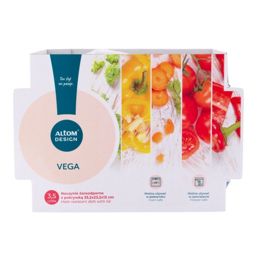 Postaw na funkcjonalność i elegancję w jednym! Naczynie żaroodporne Vega o pojemności 3,5 litra to niezastąpiony towarzysz w codziennym gotowaniu i pieczeniu. Dzięki pokrywie z dodatkową funkcją i odporności na temperaturę, Vega sprawdzi się w każdej kuchennej sytuacji – od piekarnika, przez stół, aż po lodówkę. Gotuj wygodnie, serwuj stylowo!