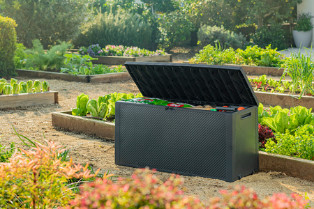 Plastikowa skrzynia do przechowywania najróżniejszych przedmiotów (poduszki, sprzęt ogrodowy) firmy KETER. Zaletą skrzyni jest łatwy montaż bez konieczności użycia narzędzi (wszystko można słożyć jak klocki), wysoka jakość skrzyni oraz nowoczesny design. Struktura imitująca drewno świetnie wpasuje się do każdego ogrodu lub na taras.
