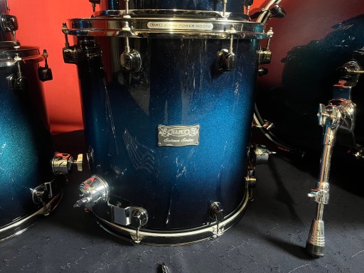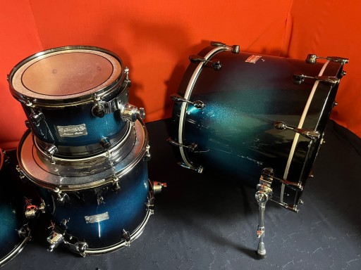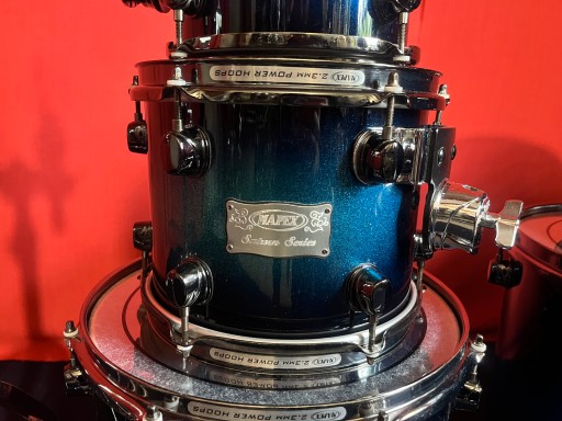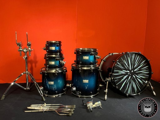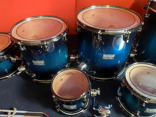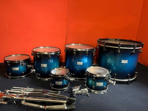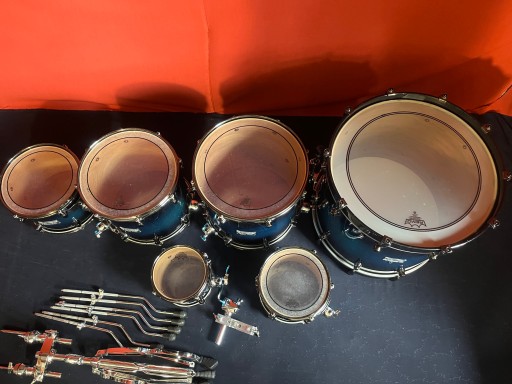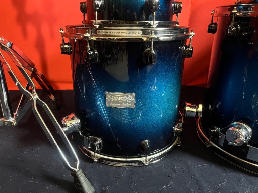 Perkusja jest w bardzo dobrym stanie i w pełni sprawna. Nosi ślady normalnego użytkowania w postaci drobnych rysek i obić. Posiada piękny lakier Blue Galaxy Sparkle Burst. Korpusy bębnów wykonane z klonu i orzecha. W komplecie solidny statyw pod tomy Mapexa oraz tom holdery i nogi do floor tomów. Piękny duży zestaw o potężnym brzmieniu. Rewelacyjnie brzmiące bębny z półki pro.