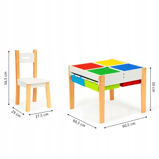 Blat stolika składa się z 2 zdejmowanych elementów. Na jednej ze stron znajdują się kolorowe plansze do układania klocków, druga strona to płaska powierzchnia, pozwalająca na rysowanie, malowanie i inne kreatywne zabawy