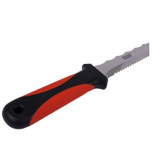 Profesjonalny nóż do cięcia wełny mineralnej, skalnej i szklanej to niezastąpione narzędzie na każdej budowie i podczas prac izolacyjnych. Ząbkowane ostrze wykonane z wytrzymałej stali nierdzewnej INOX zapewnia wysoką trwałość i precyzyjne cięcie, nawet najbardziej włóknistych materiałów.