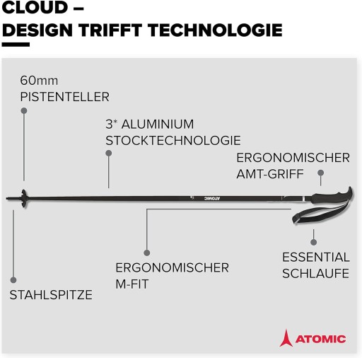 Wykonane z lekkiego, a zarazem wytrzymałego aluminium, kijki zapewniają dobrą sztywność oraz komfort użytkowania przez cały dzień na stoku. Elegancki, smukły design z dopracowanymi detalami doskonale komponuje się z linią damskich nart Atomic Cloud.