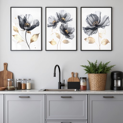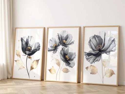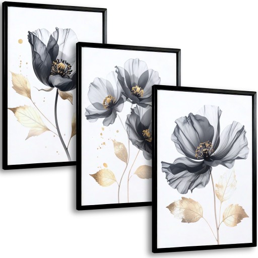 Nowoczesny zestaw trzech obrazów, który łączy elegancję z prostotą. Czarne kwiaty na białym tle z dodatkiem złotych liści tworzą wyrazistą, ale stonowaną dekorację. To idealny wybór do wnętrz, w których liczy się styl, spójność i ponadczasowa estetyka.