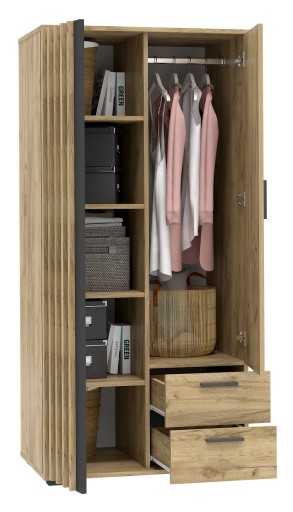Kompletny zestaw mebli do pokoju młodzieżowego, który łączy praktyczne przechowywanie, nowoczesny design z lamelami i solidne wykonanie. Idealny dla ucznia, nastolatka lub studenta – zapewnia wygodną przestrzeń do nauki, przechowywania i codziennego użytkowania, a przy tym świetnie się prezentuje.