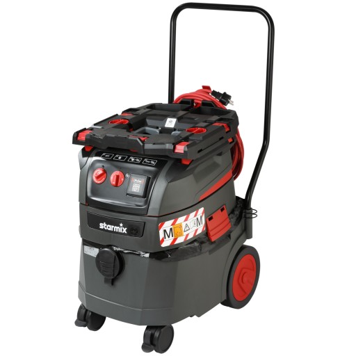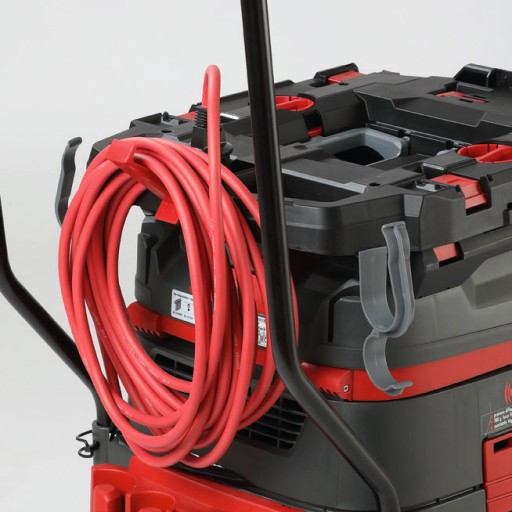 - Zintegrowany uchwyt na kabel zapewnia bezpieczny transport czerwonego przewodu zasilającego.