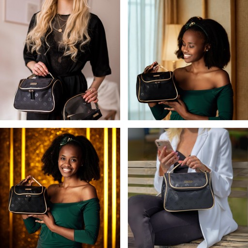 Ekskluzywne czarne kosmetyczkI z detalami w kolorze złotym pochodzą z kolekcji Blossom. Znak wodny z logiem na materiale podkreśla oryginalność produktów.
