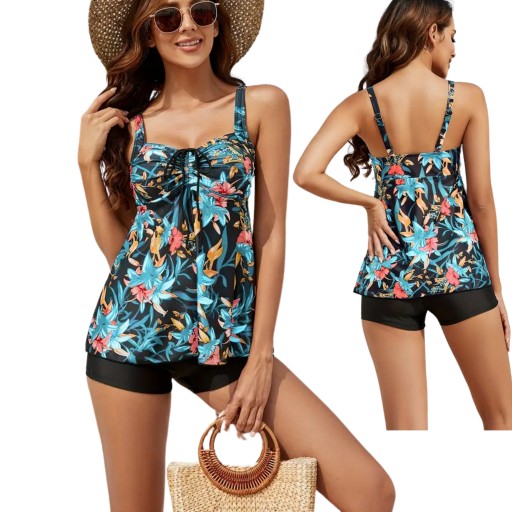 Dwuczęściowy strój kąpielowy tankini składający się z lekkiej, rozkloszowanej góry z ramiączkami oraz klasycznych czarnych spodenek z wysokim stanem. Góra wiązana na przodzie, z usztywnianymi, wyjmowanymi miseczkami – zapewnia podtrzymanie i wygodę. Materiał elastyczny, szybkoschnący i nieprześwitujący, idealnie dopasowuje się do sylwetki i tuszuje niedoskonałości.
