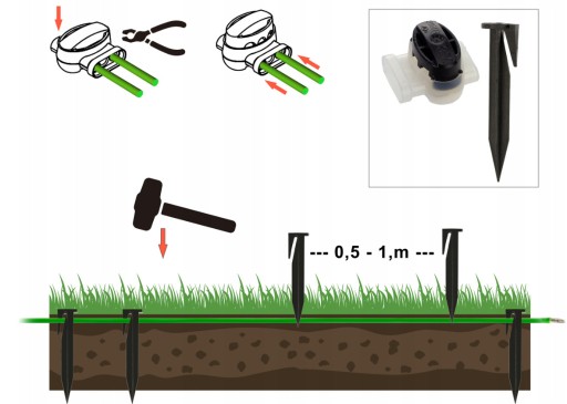 Przewód przymocowany do gruntu za pomocą szpilek zarasta trawą już po ok. miesiącu i staje się niewidoczny.
