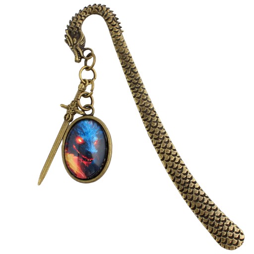 Zakładka do książki z grafiką przedstawiającą smoka. Dodatkowym elementem jest zawieszka w kształcie miecza. Świetna dla miłośników fantasy i fanów książek przygodowych.