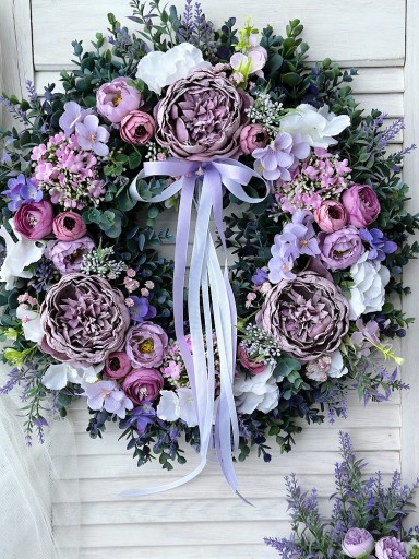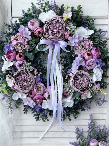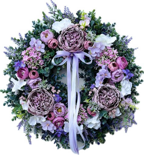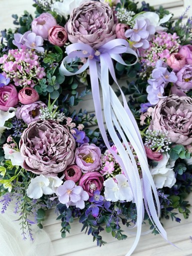 Uroczy, okazały wianek kwiatowy, ozdobiony sztucznymi kwiatami peonii, pełników, kaliny, fiołków, lawendy, hortensji oraz różnorodnymi dodatkami i kokardką